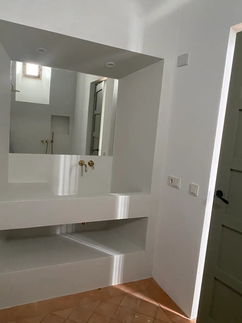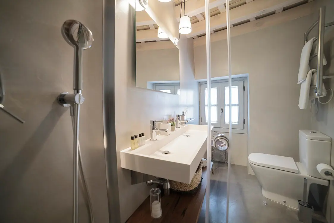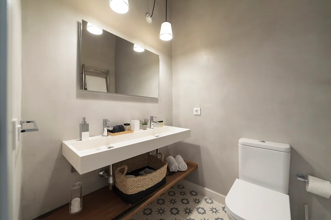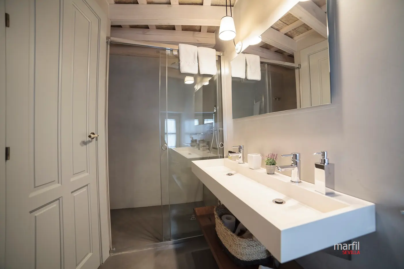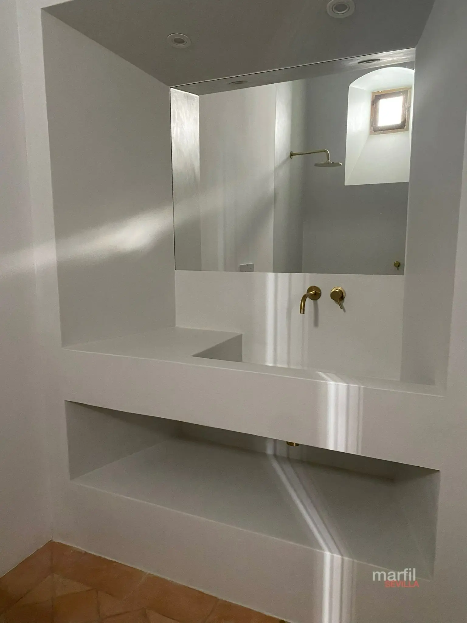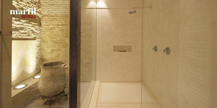 Baños revestidos con microcemento como un tapiz continuo en una joya histórica.
