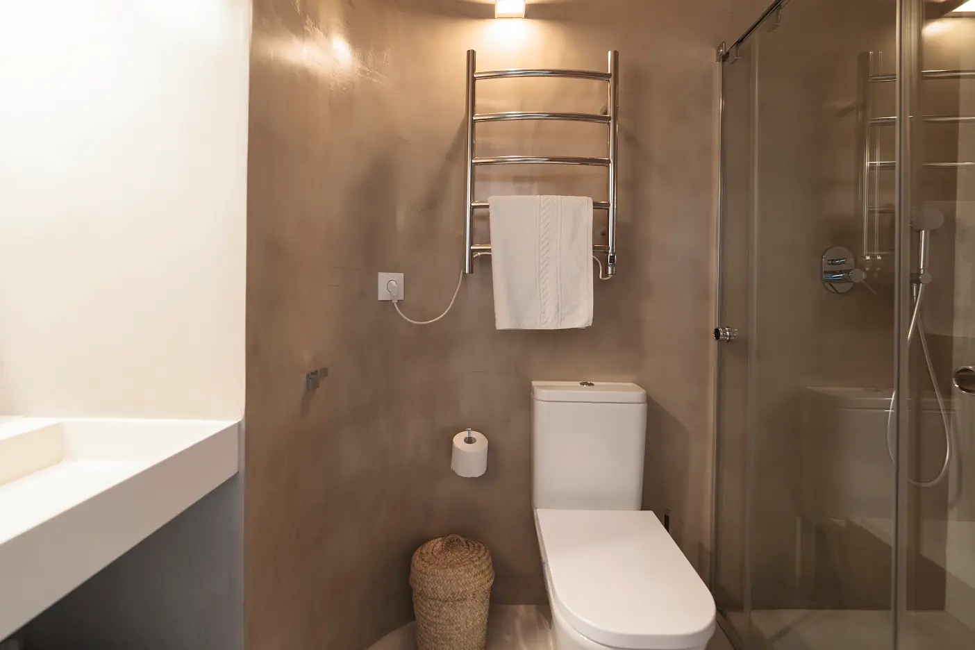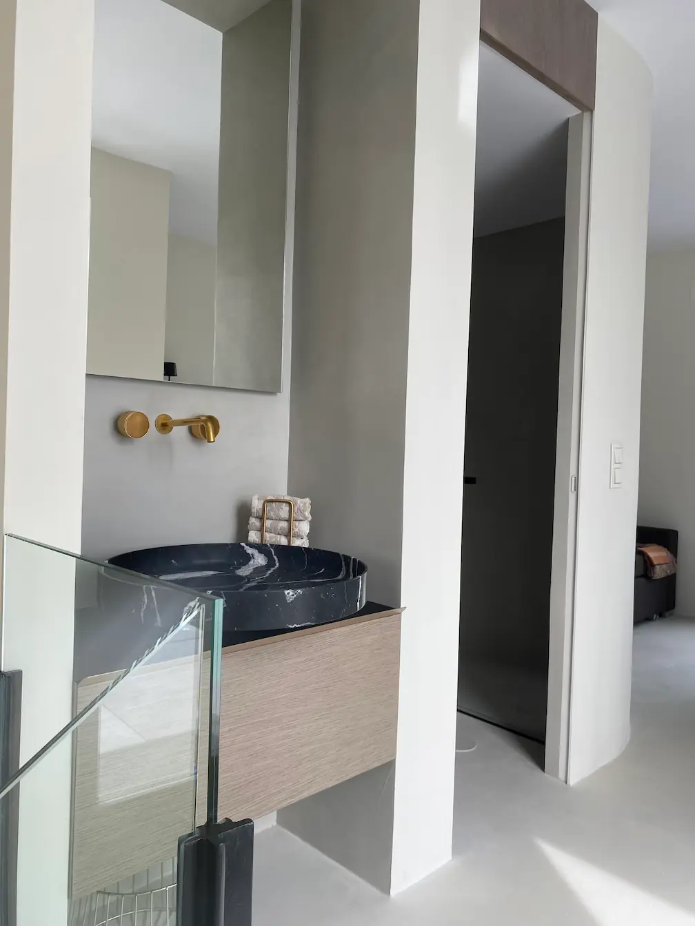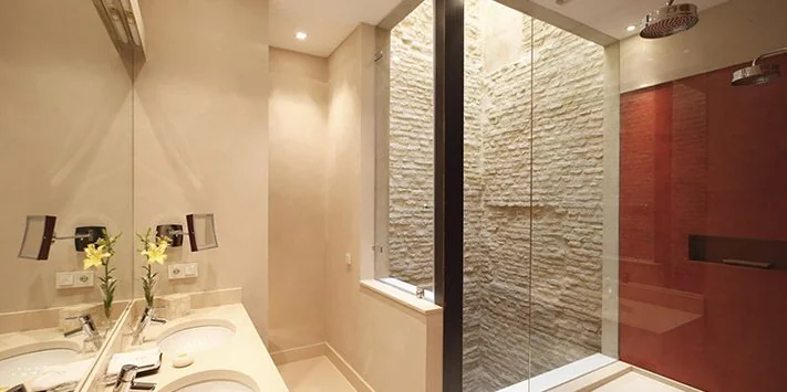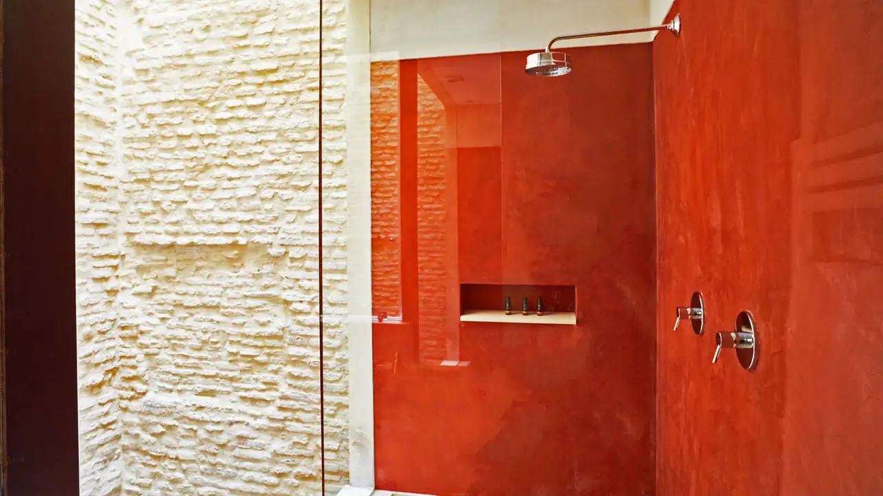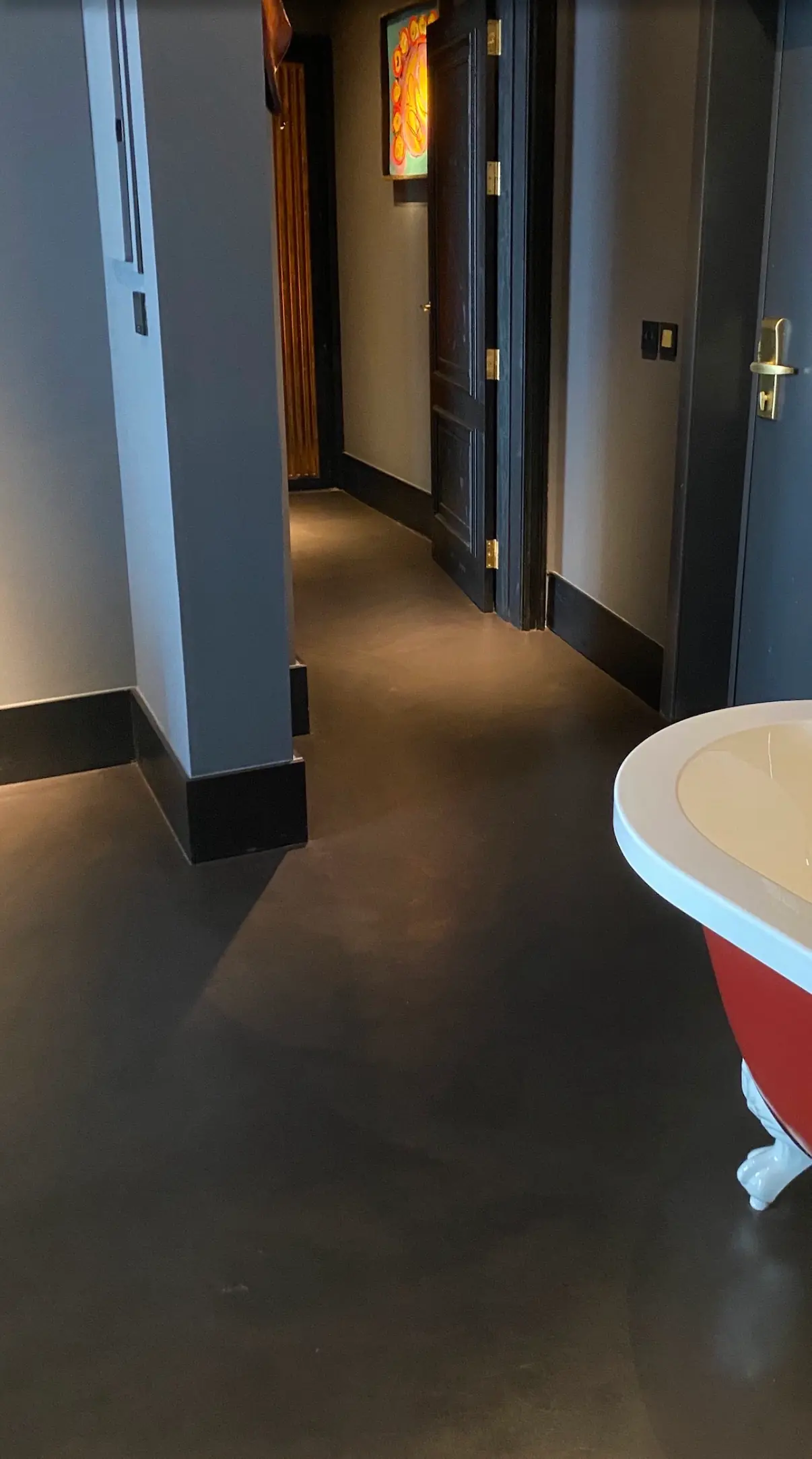 Baños revestidos con microcemento como un tapiz continuo en una joya histórica.