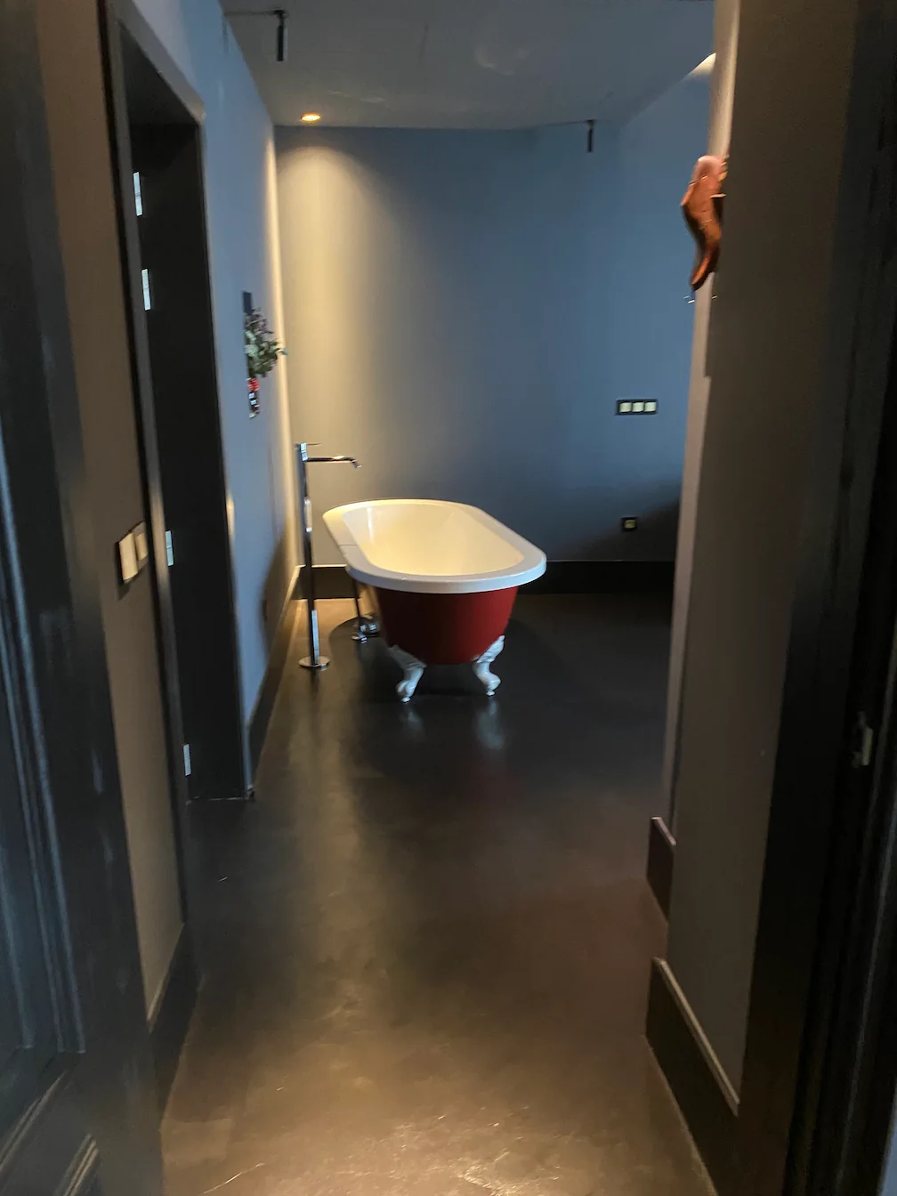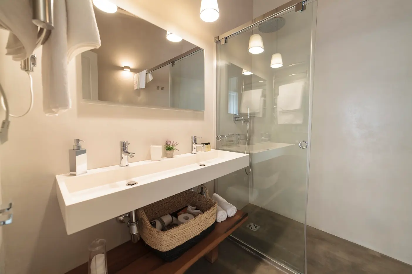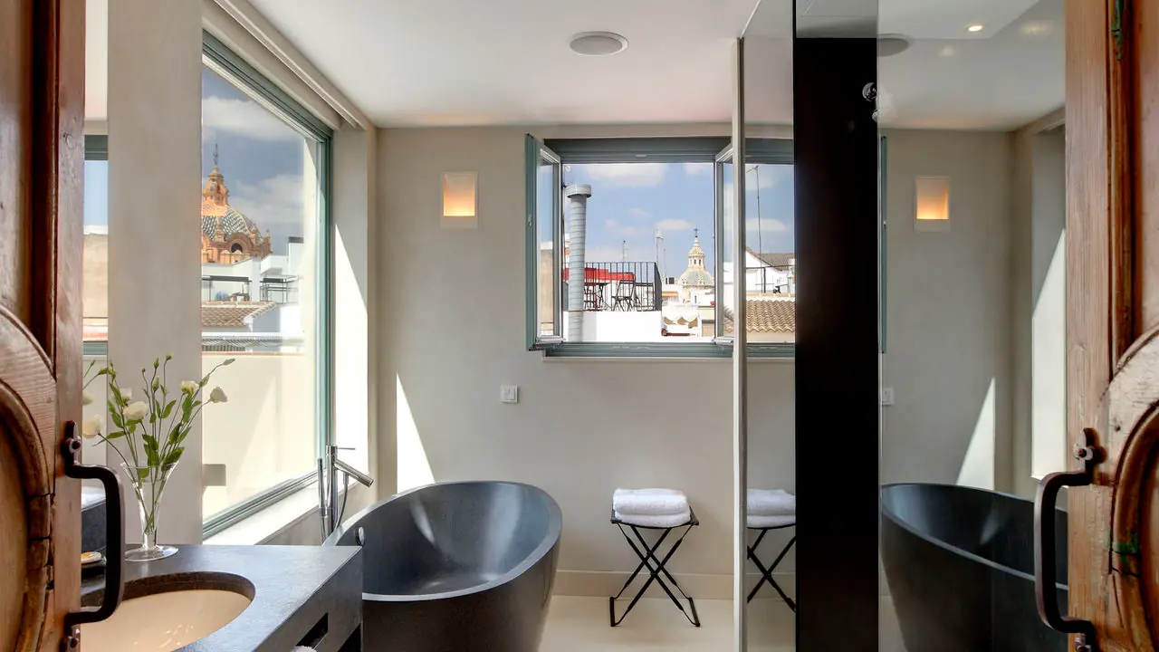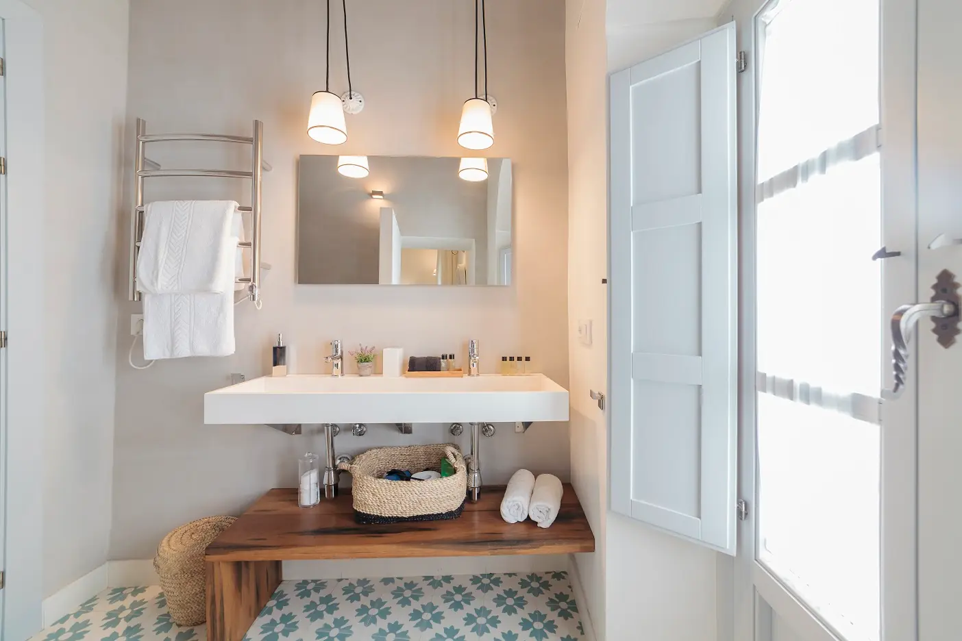 Baños revestidos con microcemento como un tapiz continuo en una joya histórica.