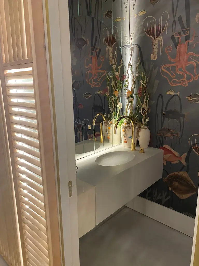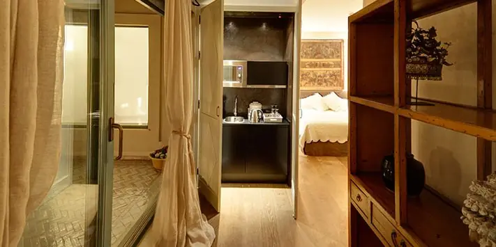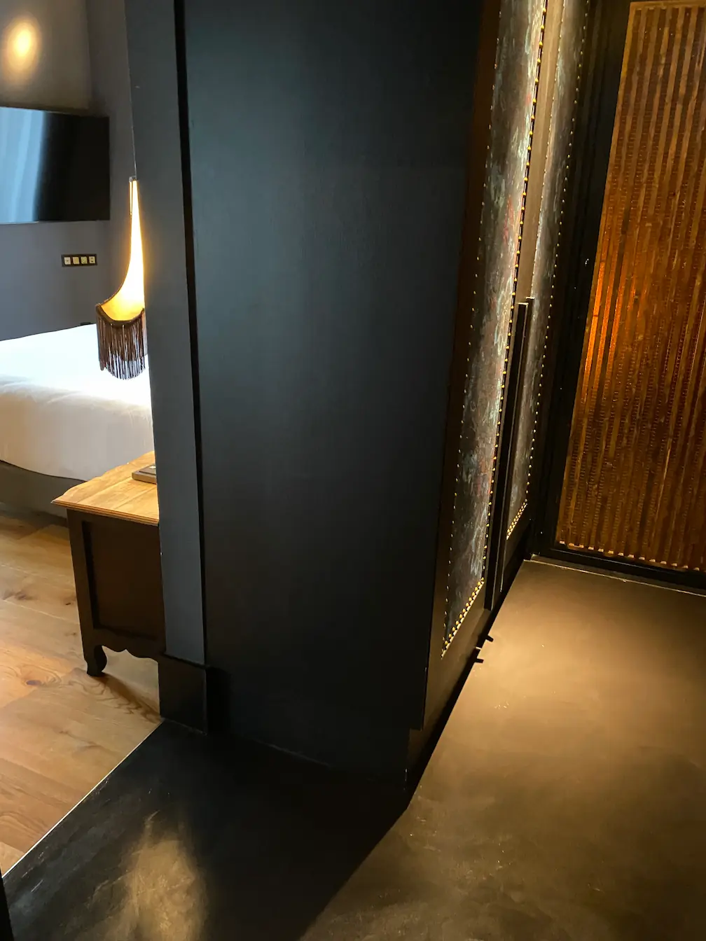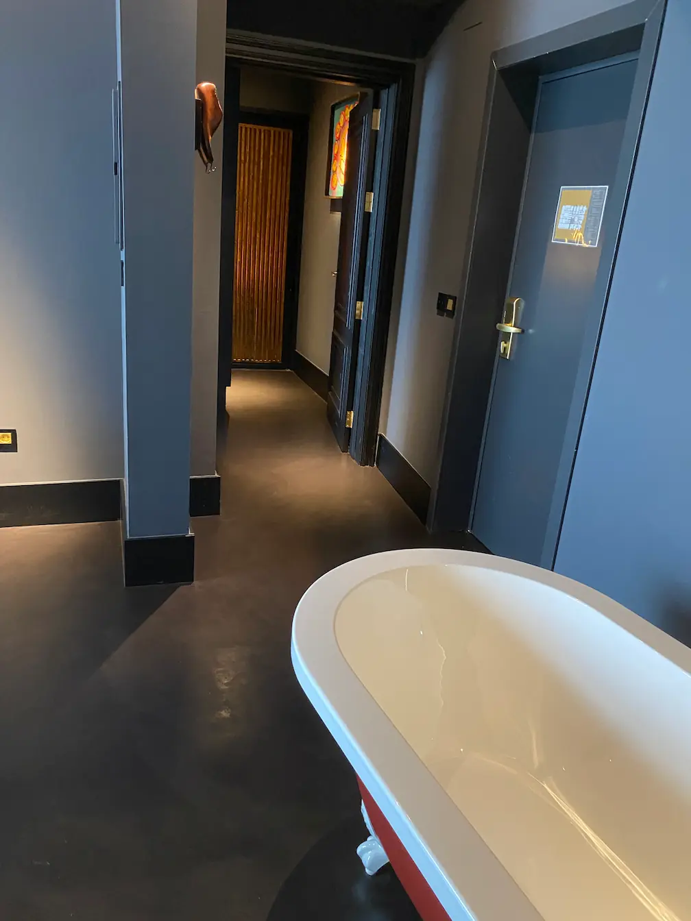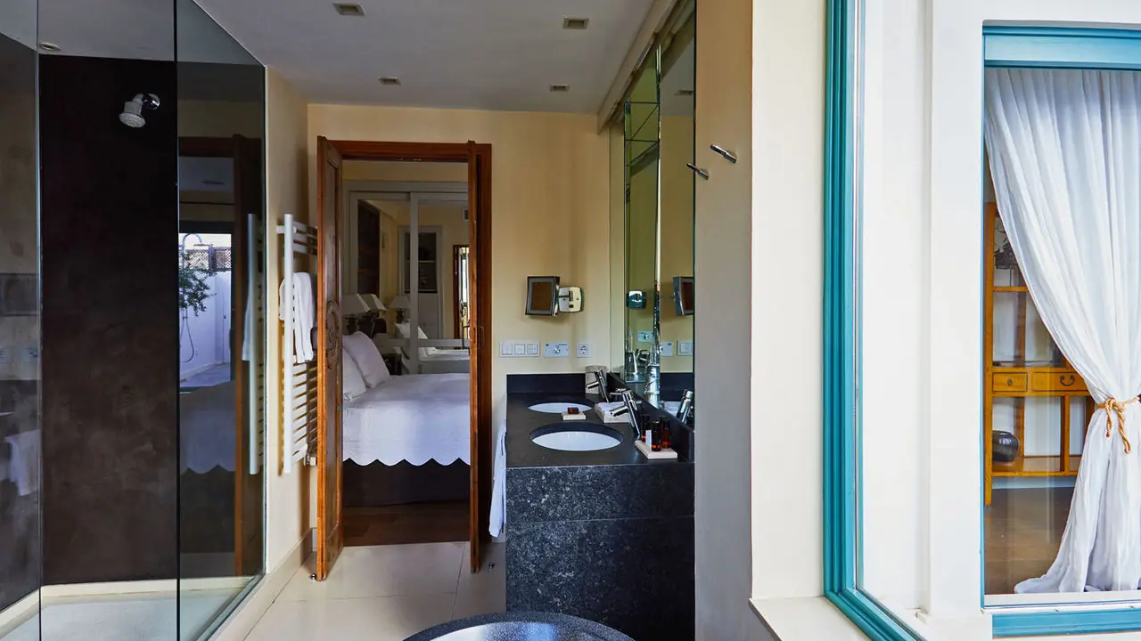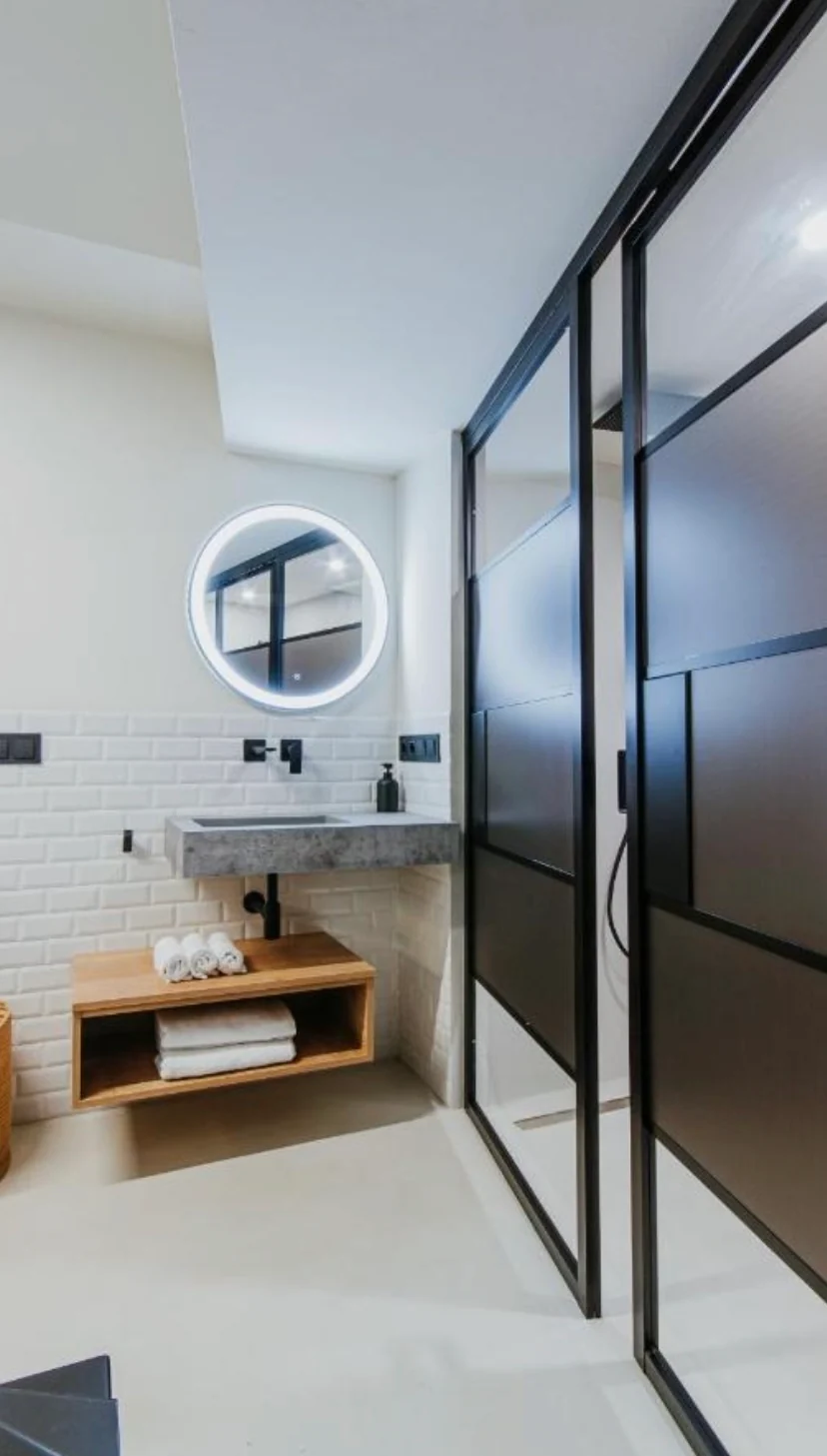 Baños revestidos con microcemento como un tapiz continuo en una joya histórica.
