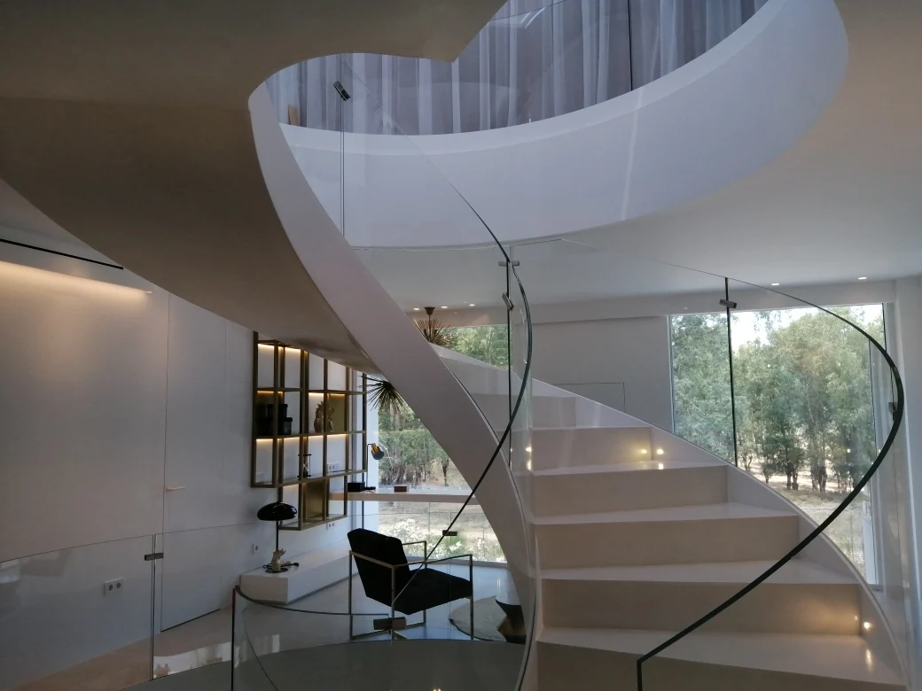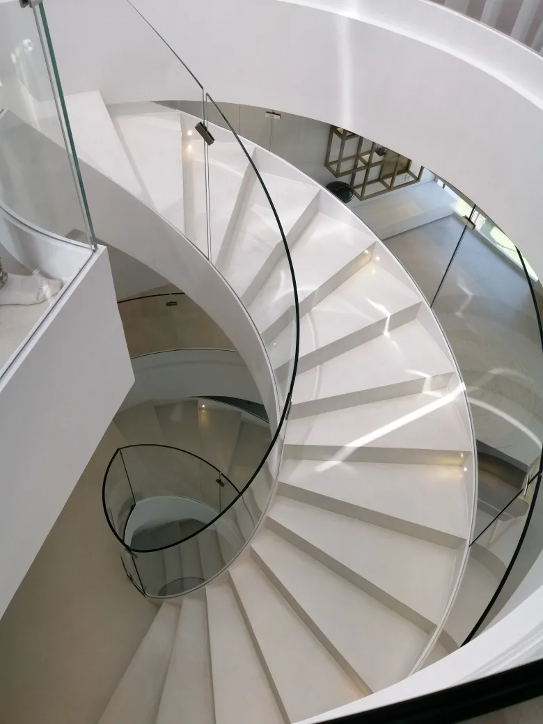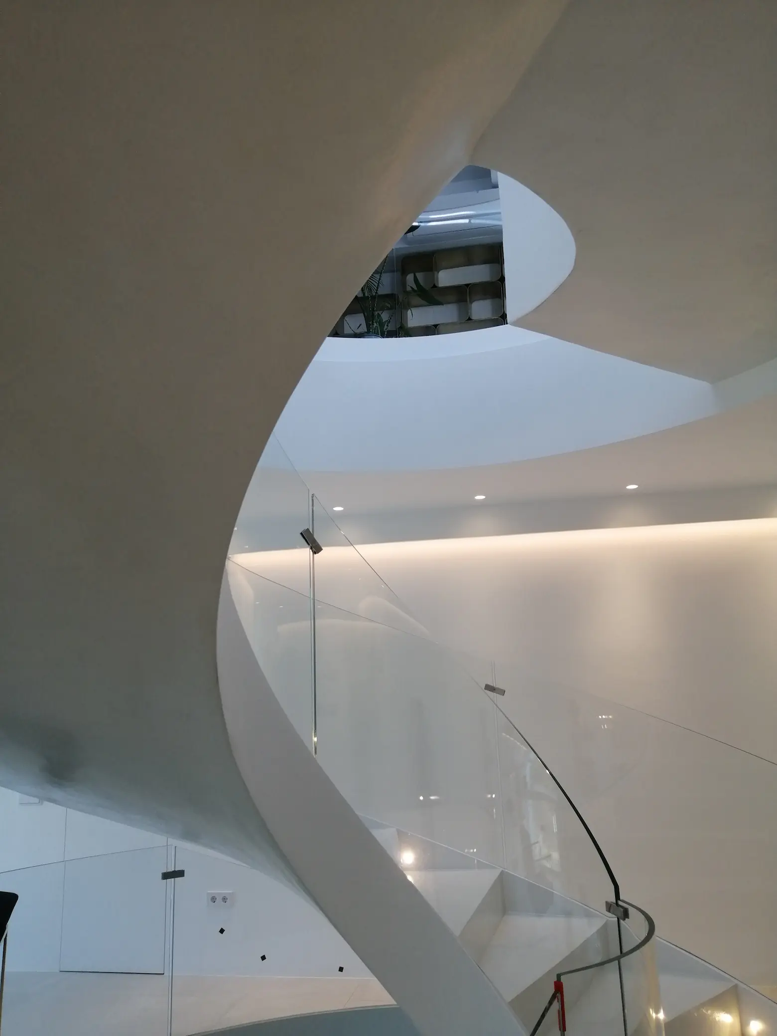 Escalera helicoidal escultórica revestida íntegramente con microcemento monolítico.