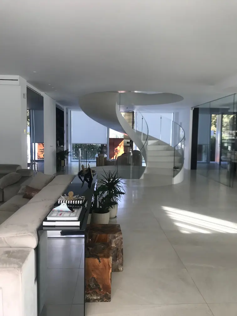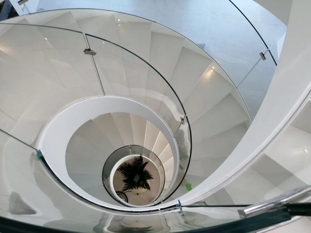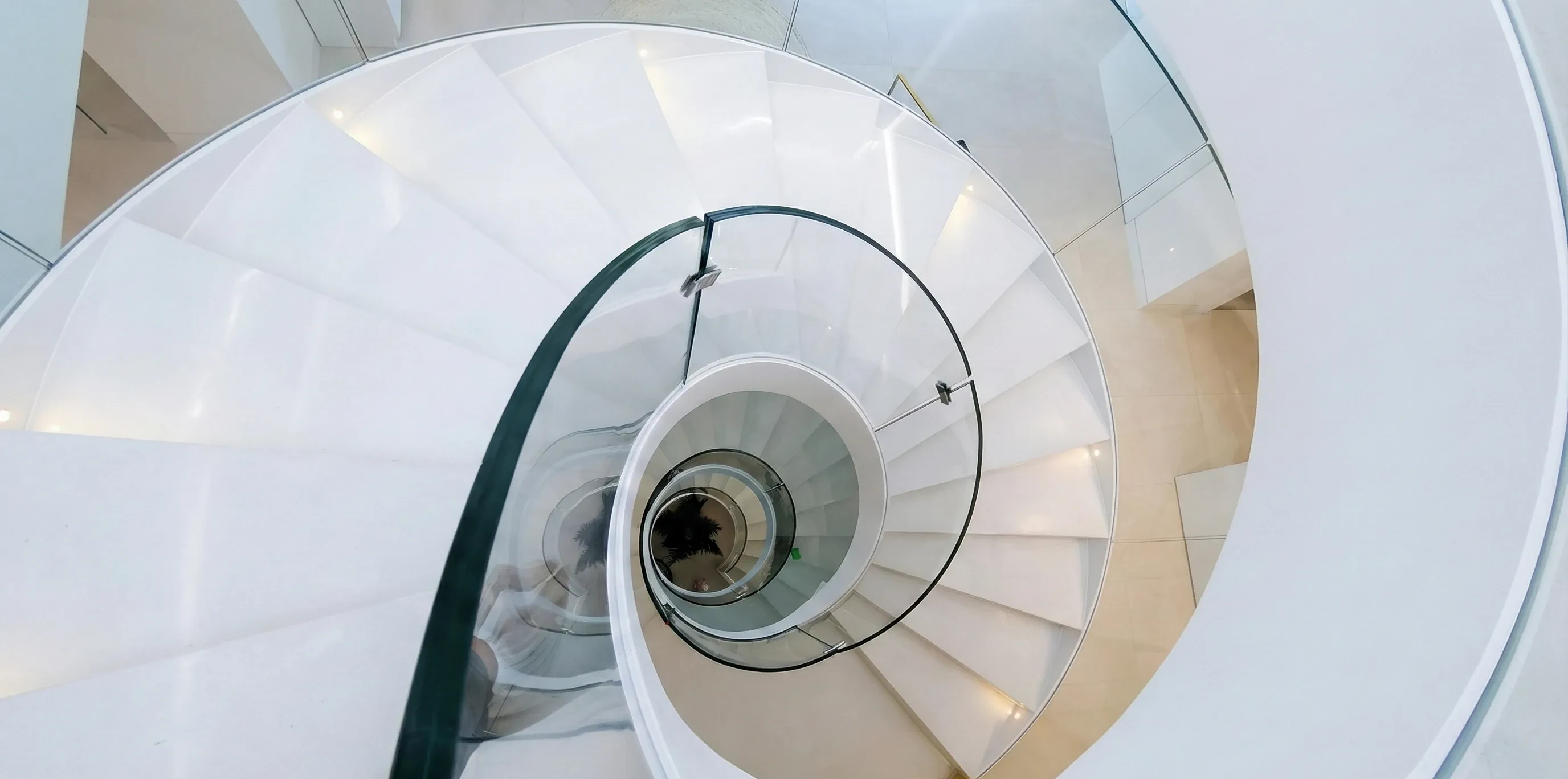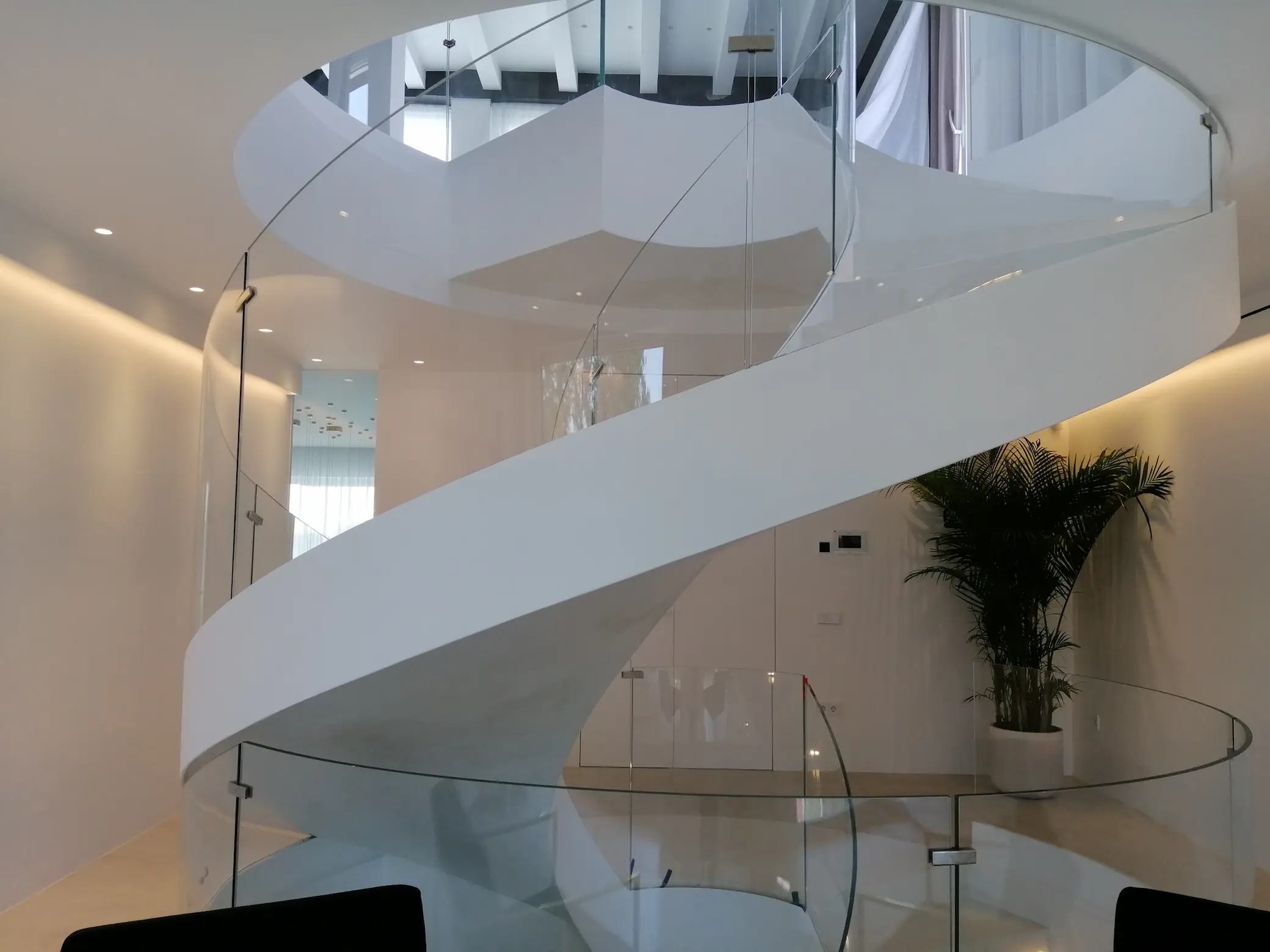 Escalera helicoidal escultórica revestida íntegramente con microcemento monolítico.